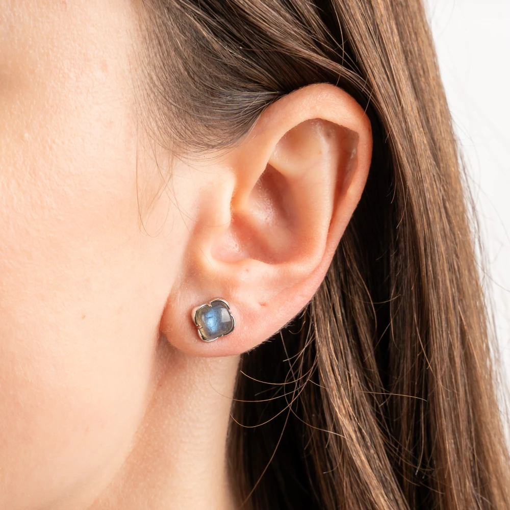 Une paire de boucles Morganne Bello en or gris 750, modèle Songe, sertie de deux labradorites cabochon, système à clous.