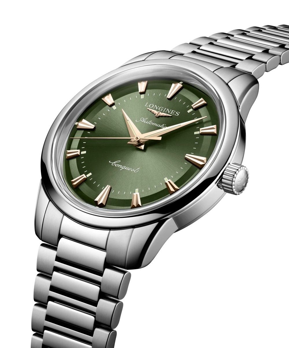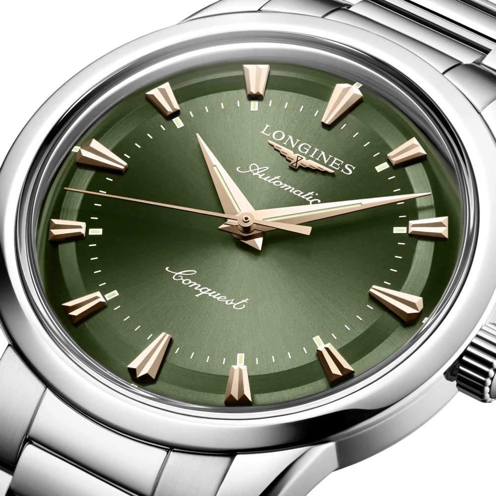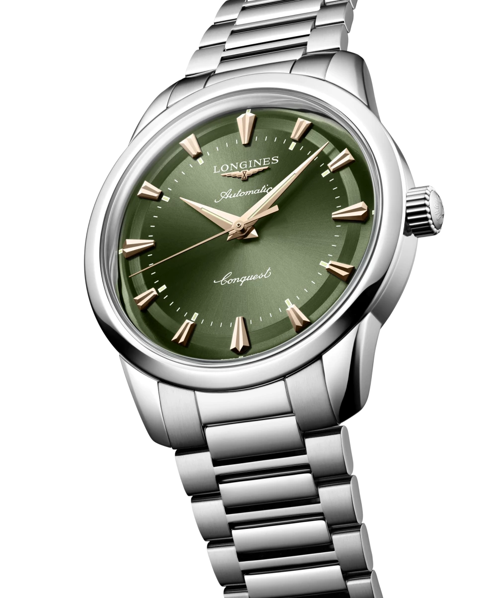 Une montre Longines, modèle Conquest Heritage, boîtier en aicer 40mm, mouvement automatique, réserve de marche environ 72h, cadran vert avec index appliqués en pvd rose, glace saphir, bracelet en acier, étanche à 5ATM.