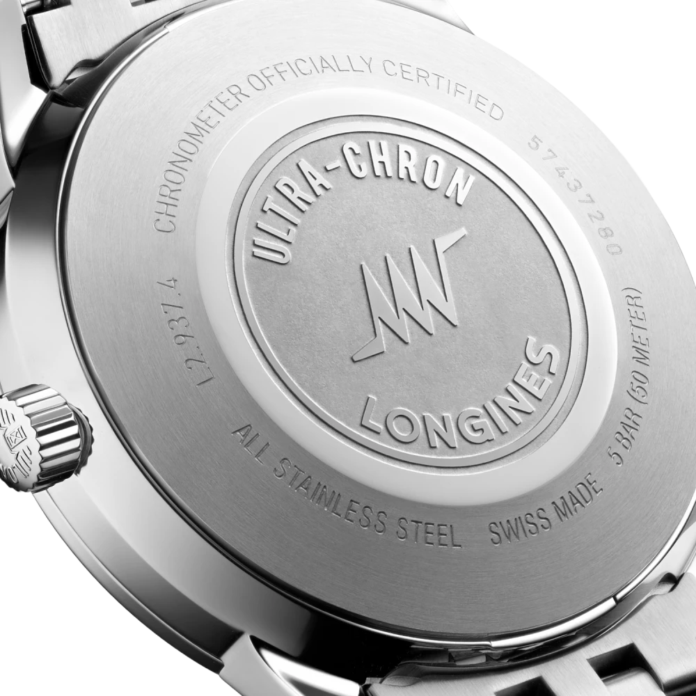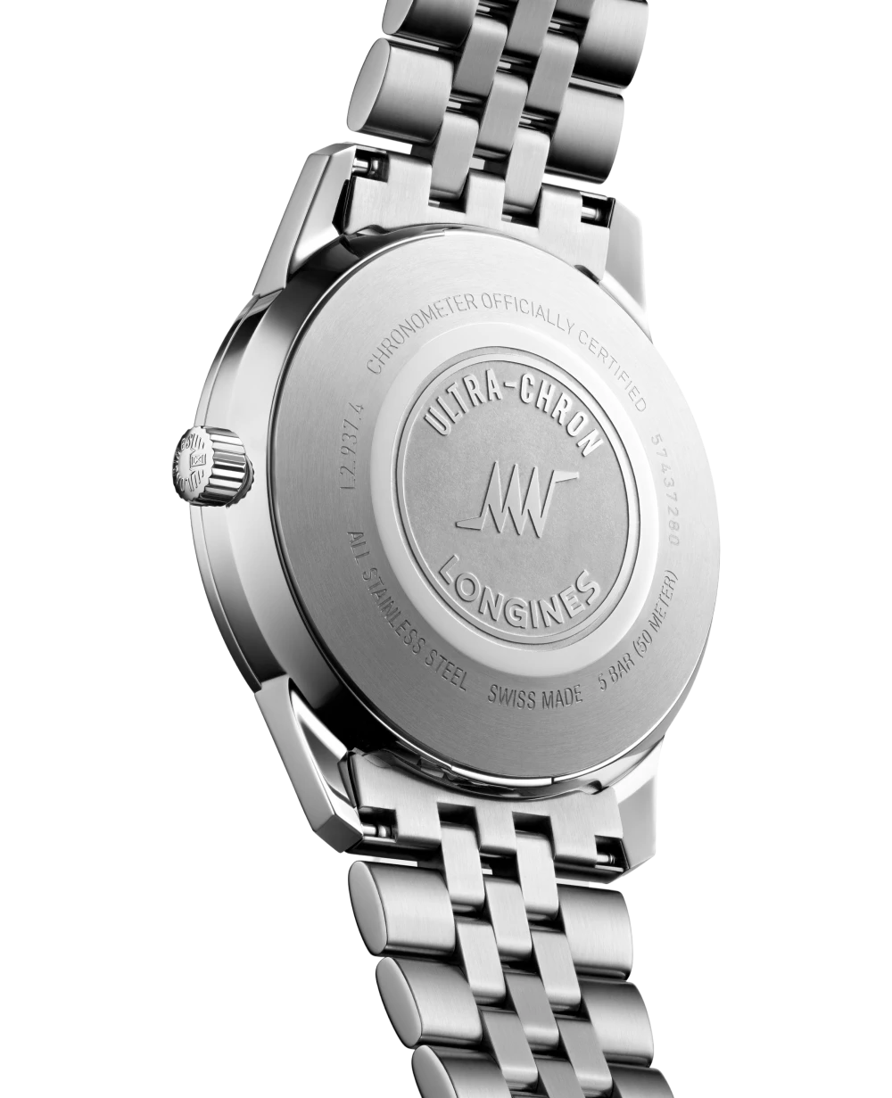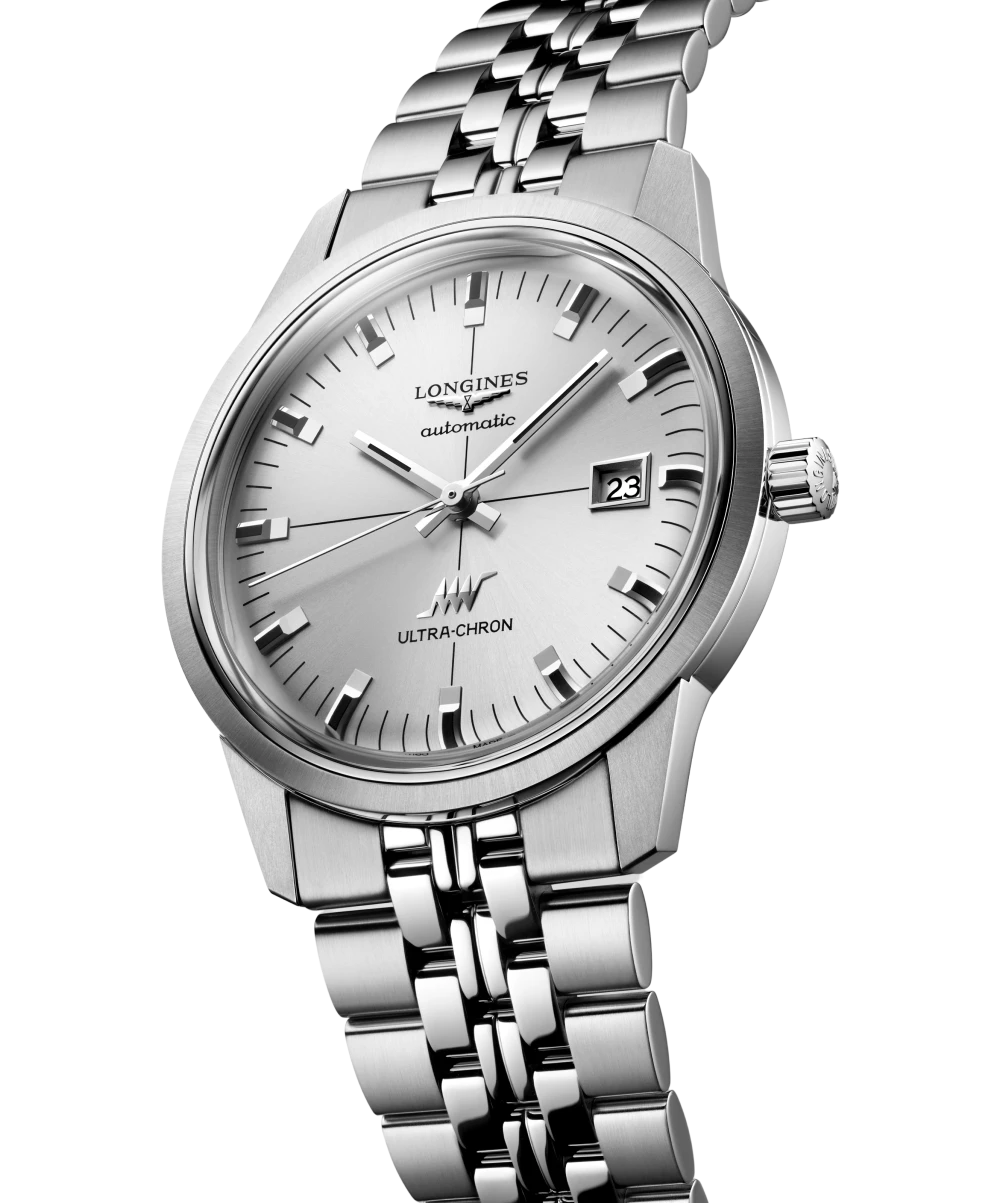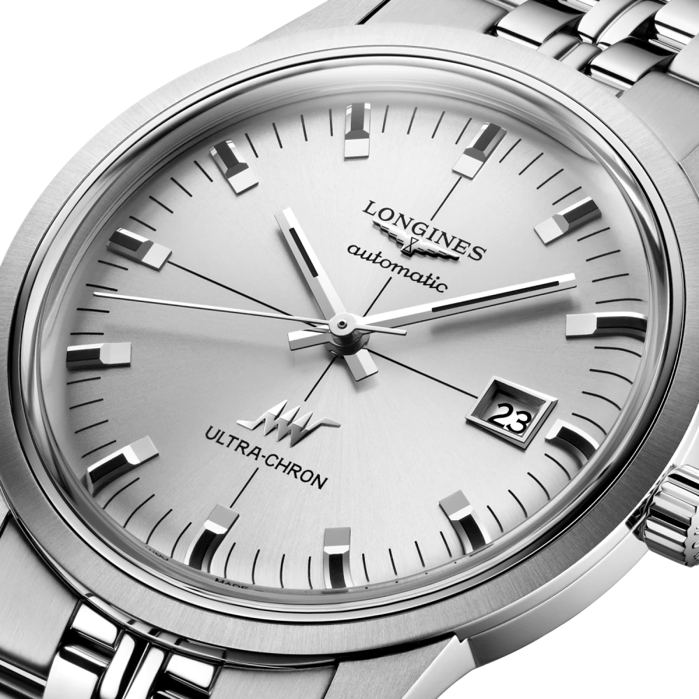 Une montre Longines, modèle Ultra-Chron, boîtier en acier 40mm, mouvement automatique avec réserve de marche d'environ 52 heures, certifié Chonomètre Longines, gris clair avec index appliqués, glace saphir, bracelet acier avec boucle déployante, étanche à 5ATM.