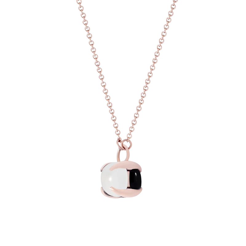 Une chaîne en or rose 750, avec un pendentif serti d'une pierre de lune blanche et une onyx carrées cabochons 2.05ct, longueur 70cm sans fermoir