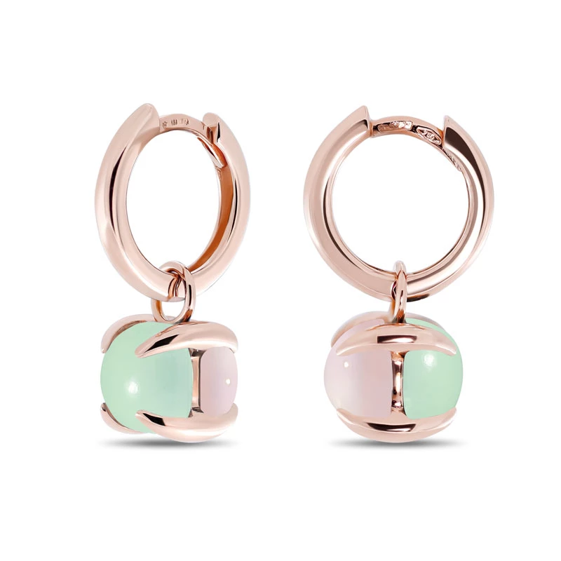 Une paire de créoles en or rose 750, avec des pendentifs serti d'une préhnite et une quartz rose carrées cabochons 2.05ct.