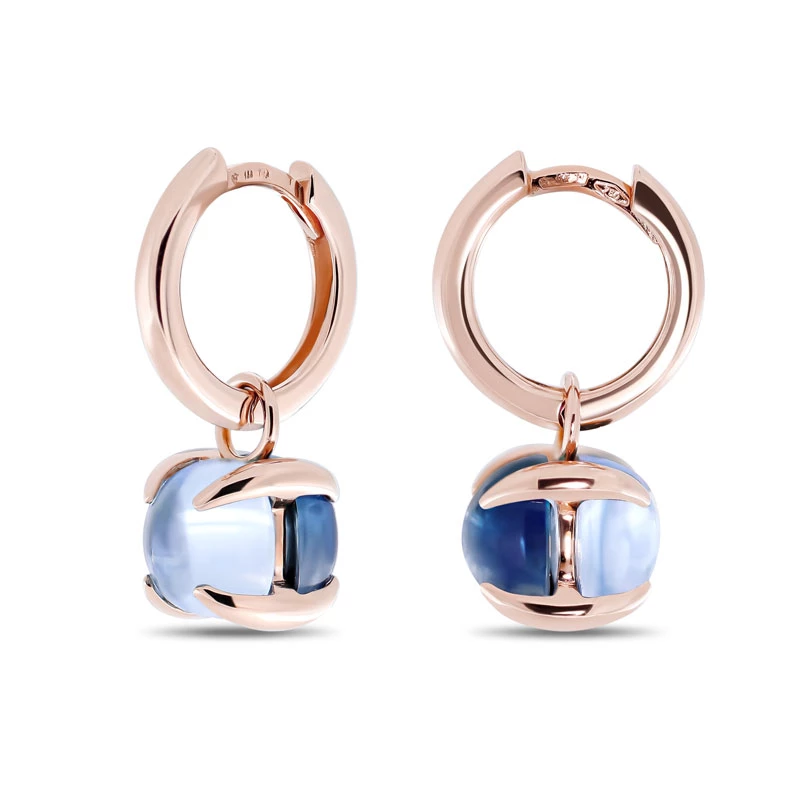Une paire de créoles en or rose 750, avec des pendentifs serti d'une topaze London blue et une topaze bleue carrées cabochons 2.05ct.